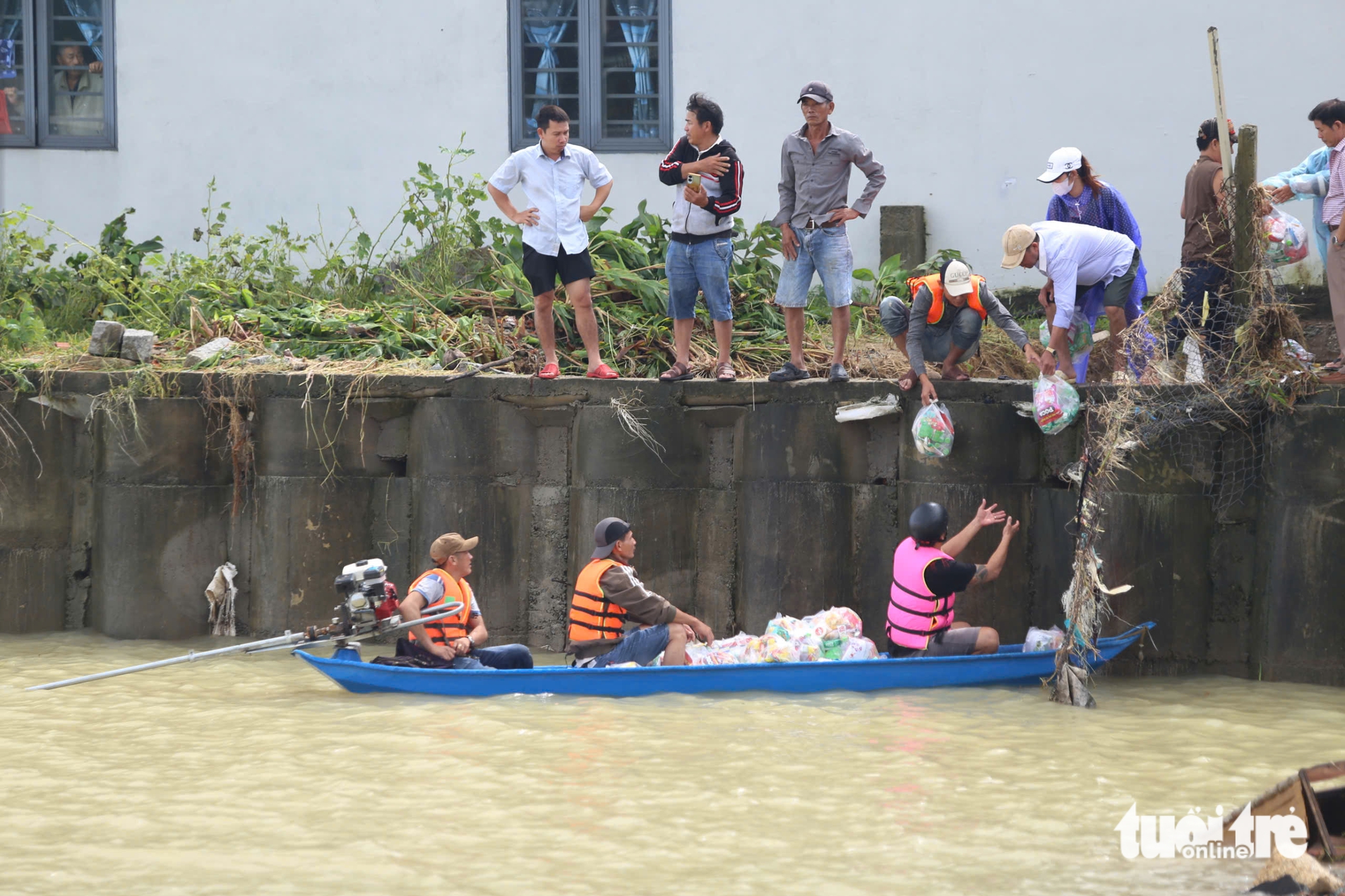 Người dân đi thuyền ra nhận hàng nhu yếu phẩm để chở vào sâu vùng lũ Hiệp Đồng – Ảnh: MINH HÒA