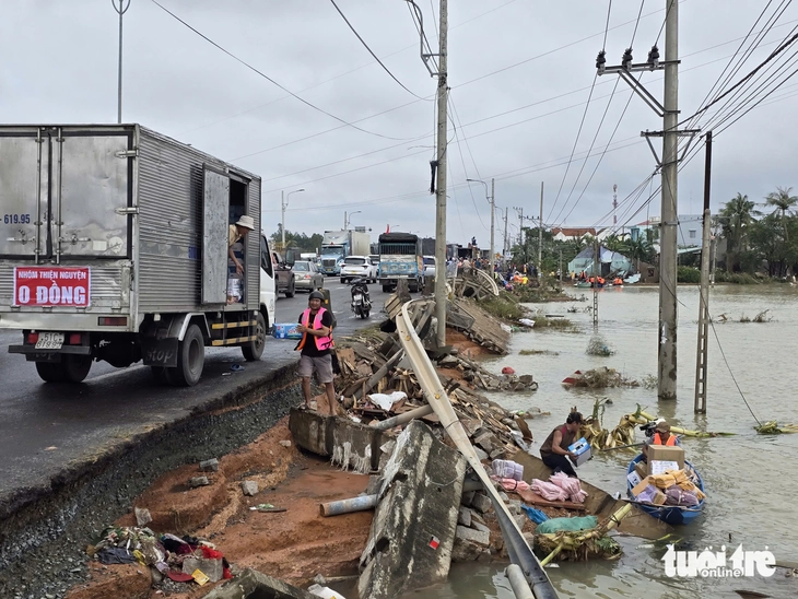 Đến sáng sớm, 1.000 ổ bánh mì đã xếp trên hai xe tiến về vùng lũ ở các xã của tỉnh Phú Yên cũ. Đường vào khu Hiệp Đồng, Hòa Xuân và xã Hòa Thịnh vẫn còn nhiều đoạn ngập.