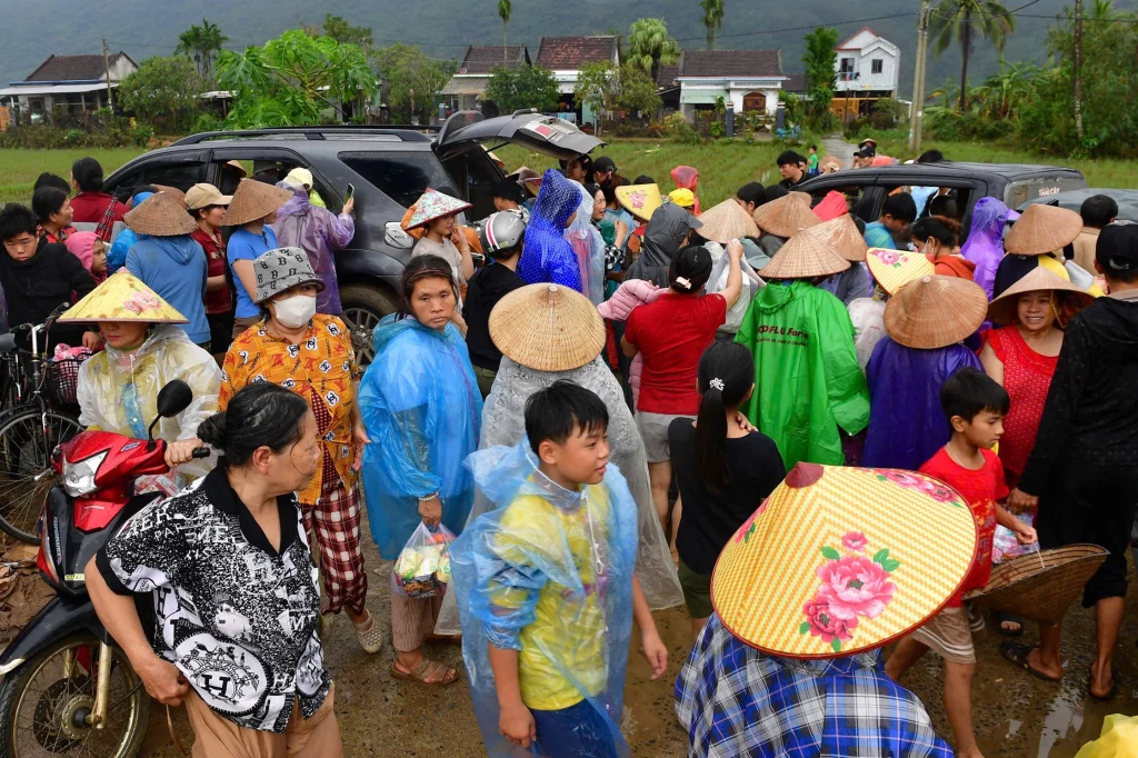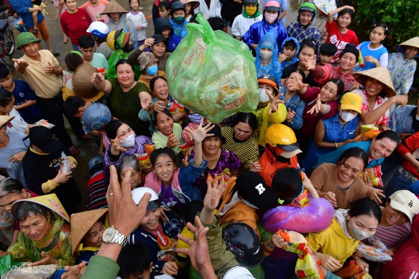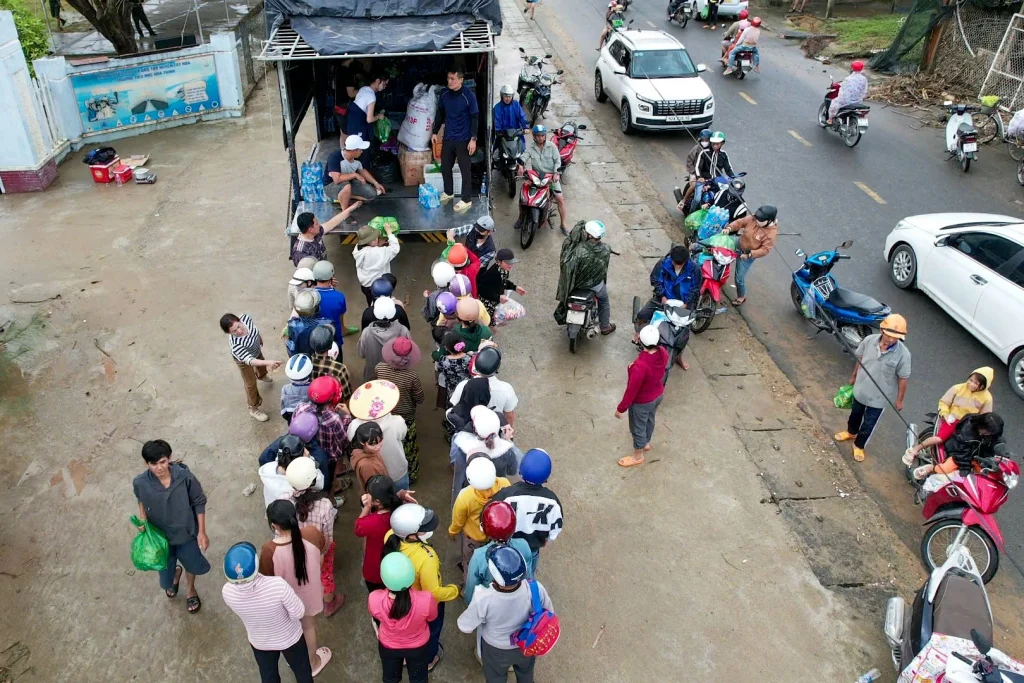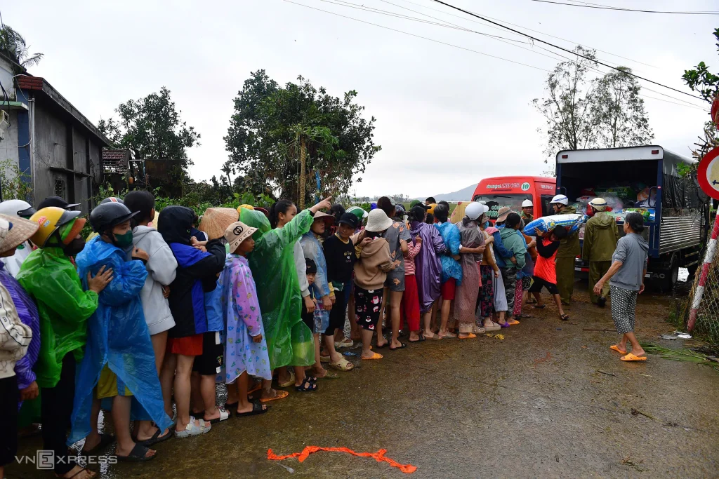Hàng nghìn người ở rốn lũ Hoà Thịnh xếp hàng nhận lương thực, đồ dùng thiết yếu do các đơn vị, tổ chức thiện nguyện chuyển tới, sáng 23/11.
