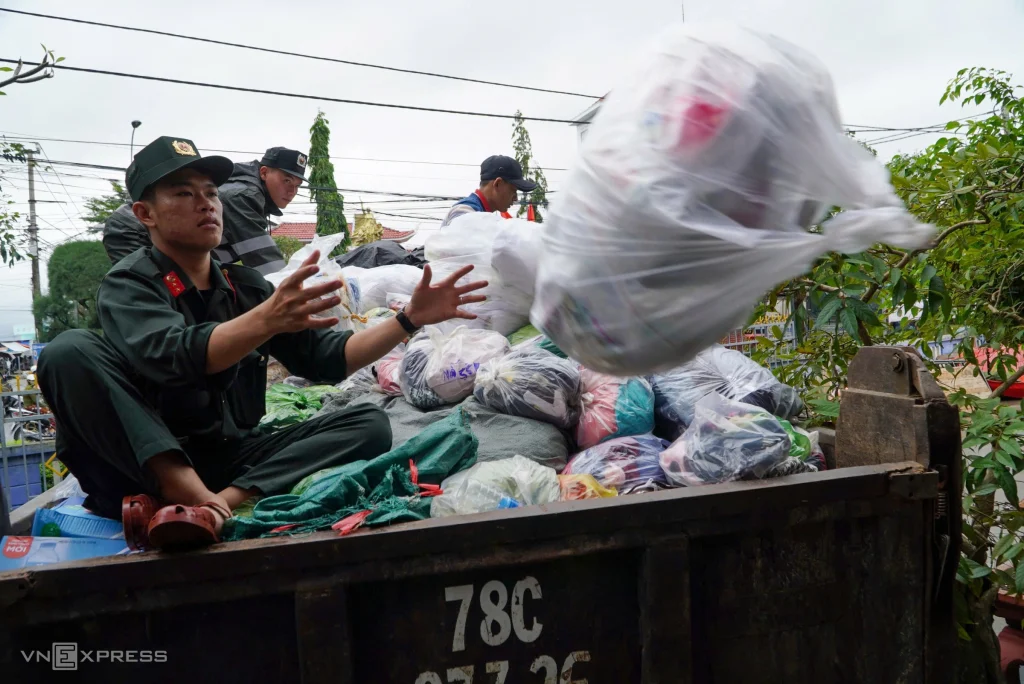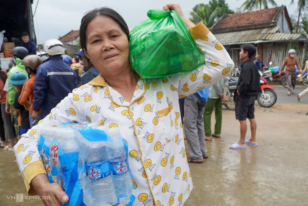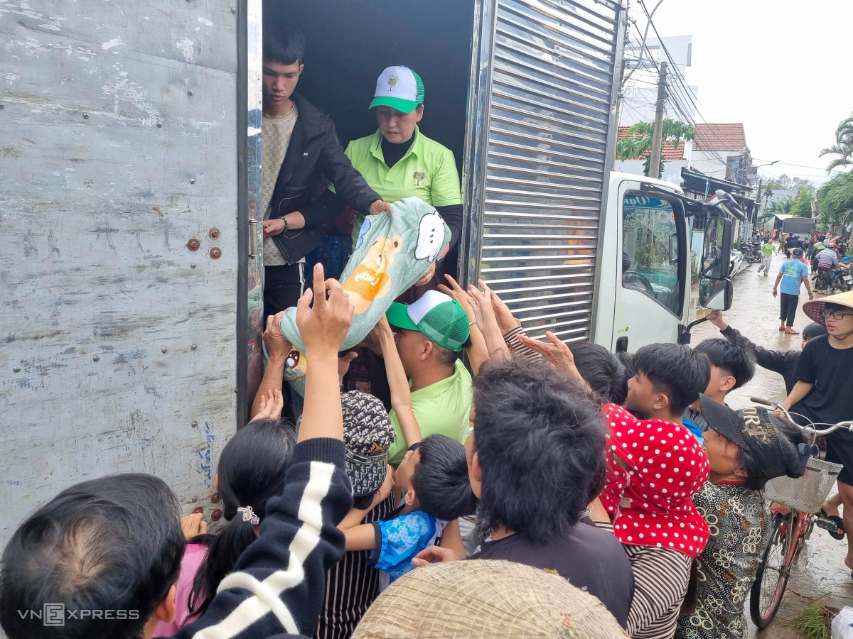 Anh Lê Chí Cường, trưởng nhóm thiện nguyện ở Cam Ranh (Khánh Hòa), cùng hơn chục thành viên đã gom hơn 20 tấn hàng từ hôm qua, rạng sáng nay mang đến hỗ trợ người dân. Nhóm chia sữa, bánh, mì gói, nước suối vào từng túi nhỏ; ngoài ra còn chuẩn bị chăn, quần áo để phát cho các hộ khó khăn.