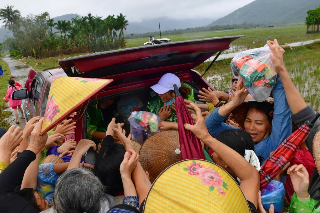 Bà Nguyễn Thị Lan nhận thực phẩm từ nhóm từ thiện. Gần một tuần qua, gia đình 5 người của bà phải trông vào đồ cứu trợ vì nhà hư hỏng, không thể nấu nướng; chợ và các cửa hàng tạp hóa đều đóng cửa hoặc khan hiếm hàng.