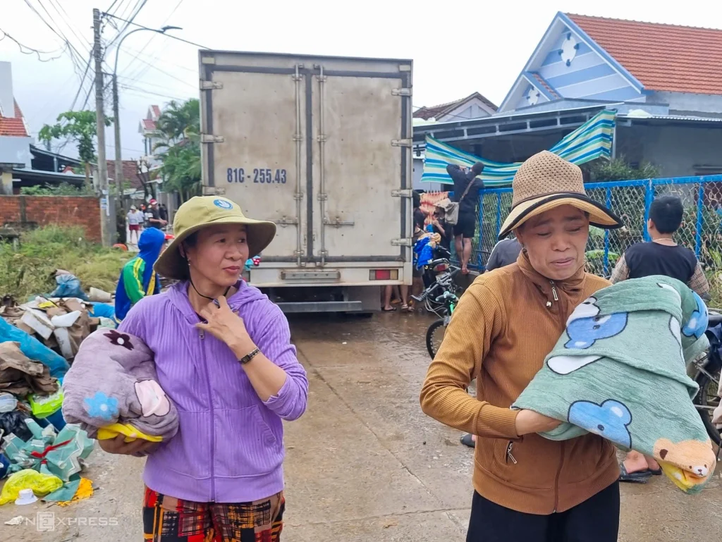 Cách đó khoảng 5 km, đông đúc người dân ở thôn Hội Cư (xã Tây Hòa) cũng đổ ra đường nhận cứu trợ. Tại đây, nhóm từ thiện chủ yếu phát những vật dụng cần thiết như chăn mền, quần áo…