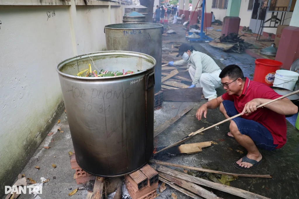 Trong 2 ngày cuối tuần, hơn 10 nồi bánh được nhóm nấu liên tục. Bà con vẫn duy trì xuyên đêm trực để đảm bảo hàng ngàn đòn bánh tét, bánh chưng hoàn thành nhanh nhất.