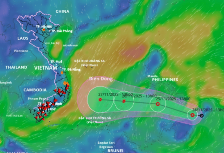 Ảnh hưởng của áp thấp nhiệt đới, từ chiều mai giữa và nam Biển Đông có gió mạnh dần lên cấp 6-8, giật cấp 10, sóng biển cao 3-5 m. Khoảng đêm 26-28/11, giữa và nam Biển Đông (gồm vùng biển phía bắc đặc khu Trường Sa) có khả năng chịu tác động của gió mạnh cấp 9-10, giật cấp 13. Tàu thuyền hoạt động trong vùng nguy hiểm này có khả năng chịu tác động.